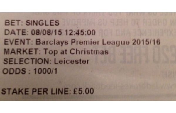 İngiltere’de bir bahisçi sezonun açılış günü olan 8 Ağustos’ta Leicester’ın noele lider girmesine 5 Sterlin yatırdı. 1’e 1001 veren bu tercih tutunca o bahisçi 5 Sterlin karşılığında 5005 Sterlin (yaklaşık 21 bin Türk Lirası) kazandı.