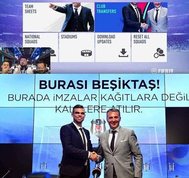 Almanya’da bir eSpor yayıncısının FIFA 19 tanıtımı sırasında, oyunun ’kulüp transferleri’ bölümünde Fikret Orman ve Pepe’nin imza töreninde verdikleri pozun kullandığı, dikkatli kullanıcıların gözünden kaçmadı.