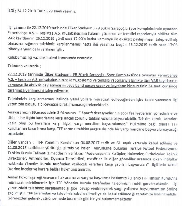 Fenerbahçe derbisindeki hakem kararlarına tepki gösteren siyah beyazlı yönetim, TFF'ye yeni bir yazı daha gönderdi. Türkiye Futbol Federasyonu'na gönderilen yazıda eğer tekrar cevap gelmemesi durumunda Cumhuriyet Başsvcılığına'na suç duyurusunda bulunacağı belirtildi.