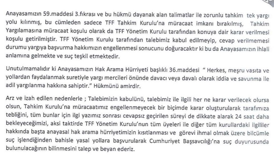 Yapılan açıklamada, "Talebizimin kabulünü, talebimiz ile ilgili her ne kadar verilecek olursa olsun, Tahlim Kurulu'na müracaatımız engellenmeyecek bir biçimde karar oluşturularak tarafımıza tebliğini, tüm bunlar için ilgi yazımız sonrasında cevapsız geçirilen süreyi de dikkate alarak 24 saat daha bekleyeceğimizi, aksi takdirde TFF Yönetim Kurulu'nun tüm üyeleri ile diğer kurullardaki ilgililer hakkında başta anayasal hak arama hürriyetimizin kısıtlanması ve görevi ihmal olmak üzere bilcümle suç işlendiğinden bahisle yasal yollara başvurularak Cumhuriyet Başsavcılığı'na suç duyurusunda bulunulacağının bilinmesini talep ve beyaz ederiz." ifadeleri yer aldı.