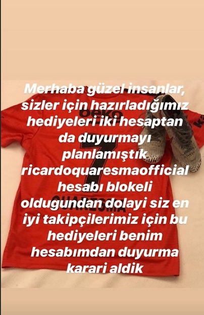 Quaresma'nın eşi, "Merhaba güzel insanlar. Sizler için hazırladığımız hediyeleri iki hesaptan da duyurmayı planlamıştık. Ancak Quaresmaofficial hesabı blokeli olduğundan dolayı siz en iyi takipçilerimiz için bu hediyeleri benim hesabımdan duyurma kararı aldık." dedi.