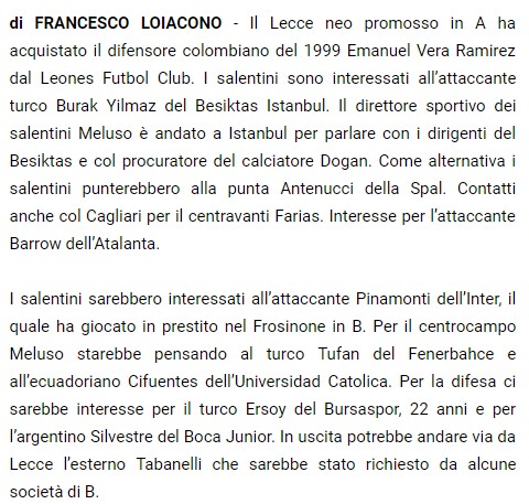 İtalyan basınında yer alan haberlere göre Lecce Sportif Direktörü Mauro Meluso'nun Türkiye'ye geldiği ve bir dizi transfer görüşmeleri yaptığı belirtildi. Meluso'nun ilk olarak Burak Yılmaz için görüşme yapacağı ardından Ozan Tufan ve Ertuğrul Ersoy için de temaslarda bulunacağı iddia edildi. Lecce'nin bu isimleri kadrosuna katma konusunda ısrarcı olacğaı da vurgulandı.