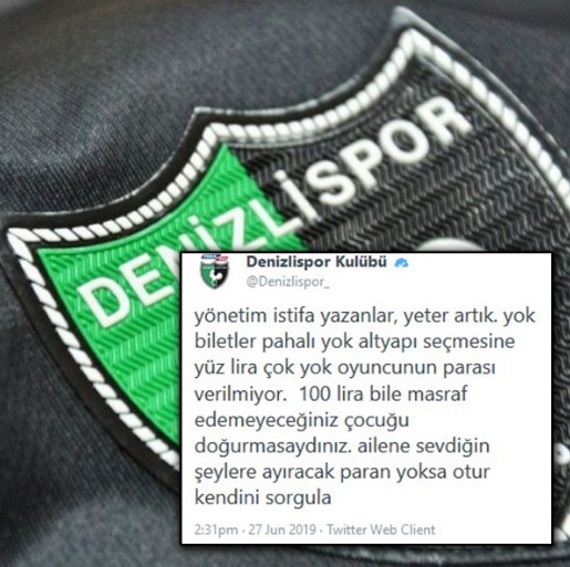 Süper Lig'e yükselen Denizlispor'un kombine ücretlerini paylaştığı fotoğrafın altına gelen eleştirilere kulüpten sert tepki geldi. Taraftarların altyapı seçmeleri için istenen fiyatı eleştirmesine, "Yönetim istifa yazanlar, yeter artık. Yok biletler pahalı, yok altyapı seçmesine 100 lira çok, yok oyuncunun parası verilmiyor. 100 lira bile masraf edemeyeceğiniz çocuğu doğurmasaydınız. Ailen, sevdiğin şeylere harcayacak paran yoksa otur kendini sorgula" şeklinde yanıt verildi.