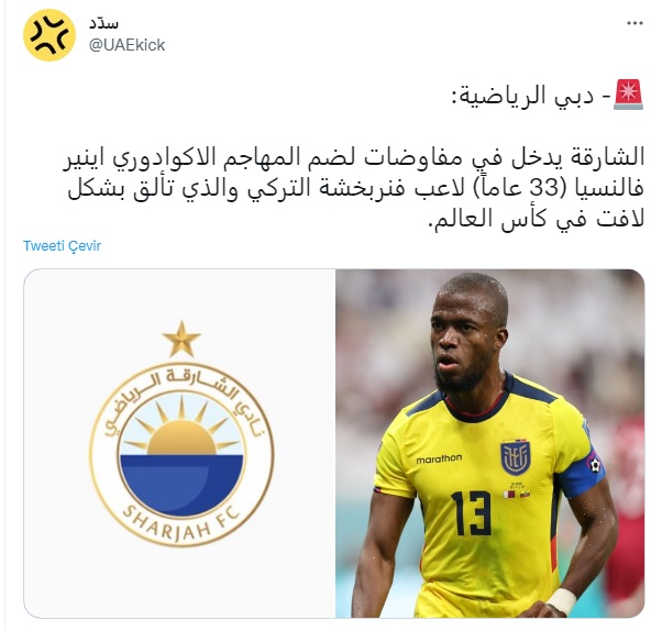 Dubai Sports'un haberine göre kulübe yakın kaynaklar, Al Sharjah takımı Enner Valencia'yı kadrosuna katmak istiyor. Yönetimin bu doğrultuda çalışmalara başladığı ve Fenerbahçe kulübüyle görüşeceği ifade edildi.