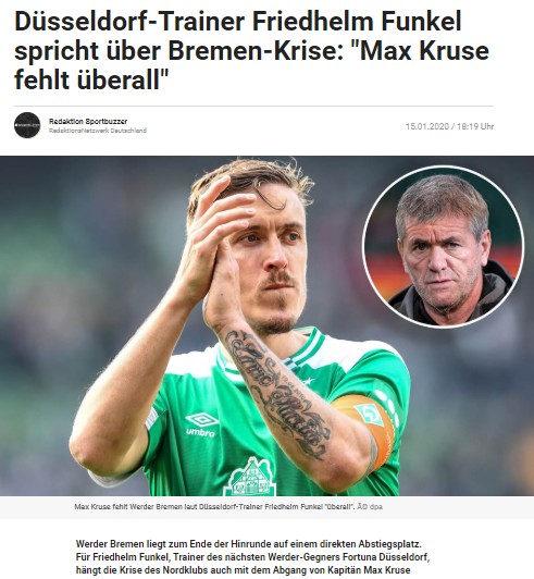 Bundesliga'da Werder Bremen ile karşılaşacak olan Fortuna Düsseldorf'ta teknik direktör Funkel, maç öncesi basın toplantısında Max Kruse hakkında sorulan soruya yanıt verdi. Funkel, Max Kruse'un Werder Bremen için önemine değinirken, "Takım arkadaşlarına sahip çıkan bir isimdi. Genç futbolcular onun gölgesinde olgunlaştı, takım arkadaşları için medyada da her zaman koruyucu bir kalkan gibiydi. Neredeyse tüm takımın hayatını şekillendiriyordu. Bremen için her anlamda kayıp oldu" dedi.