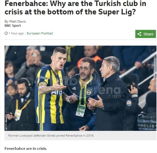 Fenerbahçe'nin 19 şampiyonluğunun olduğu ve geçtiğimiz sezonu 2. sırada bitirdiği belirtilirken, 1959 yılından bu yana sarı lacivertlilerin en düşük puanla ilk yarıyı tamamladığı vurgulandı. Fenerbahçe'nin içinde bulunduğu krizi anlatmak için "Liverpool veya Arsenal'in bu sezon Premier Lig'de küme düşme bölgesinde olduğunu hayal edin ve resmi görün" ifadeleri kullanıldı.