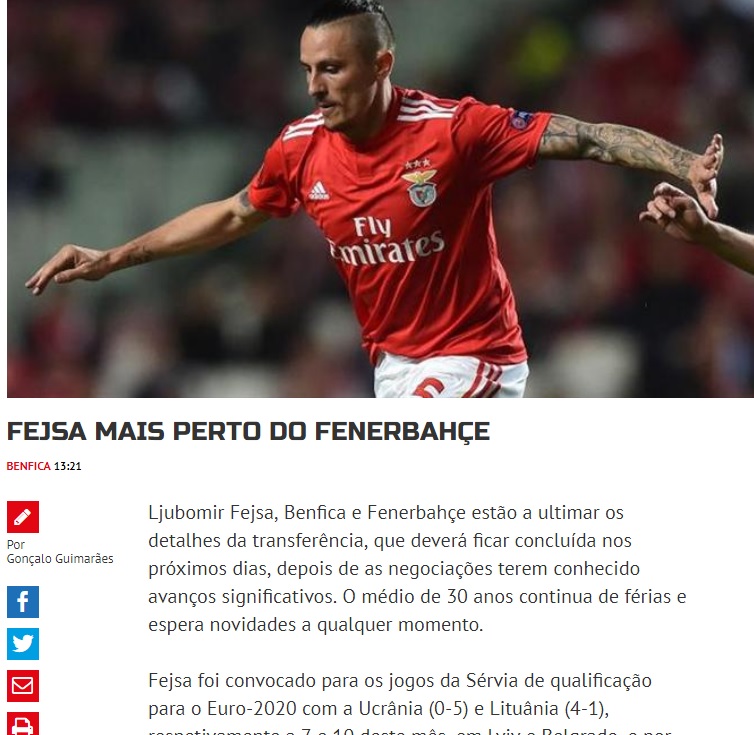 A Bola'nın haberine göre; Fenerbahçe ile Benfica arasında yürütülen görüşmelerde önemli ölçüde yol alındı ve artık son detayların görüşüldüğü belirtildi. Önümüzdeki günlerde son pürüzlerin ortadan kaldırılarak transferin gerçekleşmesi bekleniyor. Şu anda tatilde olan Fejsa ise bir an önce kulüplerin anlaşmasını bekliyor.