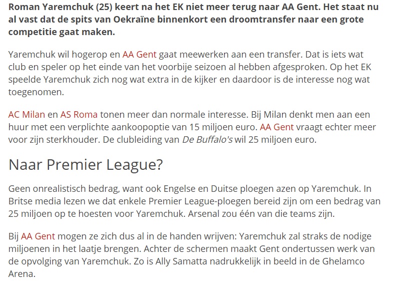 Milan ve Roma'nın istediği Yaremchuk için 15 milyon euro gözden çıkarıldı. Gent kulübü eğer Yaremchuk'u satarsa Samatta'yı transfer etmek için harekete geçecek.