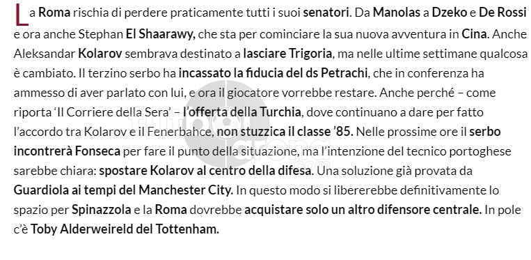 Uzun süredir Fenerbahçe'nin kadrosuna katmak istediği Kolarov'un geleceğiyle ilgili son 1 haftada karar değişikliği yaşandığı iddia edildi. Corriera della Sera'nın haberine göre, Kolarov önümüzdeki sezon da Roma'da kalmaya sıcak bakarken, Sırp futbolcu önümüzdeki sezon durumu hakkında teknik direktör Fonseca ile görüşecek. Fonseca ise Kolarov'a daha önceden onu stoperde oynatmayı düşündüğünü söylerken, ikili arasında yapılacak olan görüşmenin ardından son kararın verileceği kaydedildi.