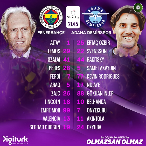 Fenerbahçe-Adana Demirspor maçı ilk 11'leri