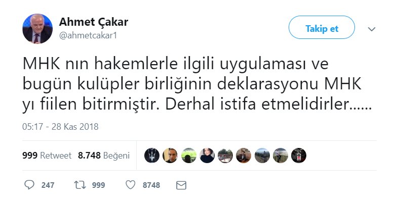 Sosyal medyadan paylaşımda bulunan Ahmet Çakar, MHK’nin istifa etmesi gerektiğini ifade etti.