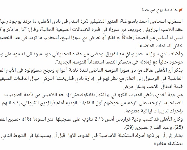 Al Ahli kulübü yöneticisi Ahmed Bamaodah, "Çıkan haberler tamamen asılsız. Gerçekten basında çıkan haberlere şaşırıyorum. Josef de Souza şu anda takımla çalışıyor ve bizimle devam ediyor. Yeni sezon hazırlıklarına devam ediyor. Josef de Souza satılık değil ve onu göndermeyi düşünmüyoruz." dedi.