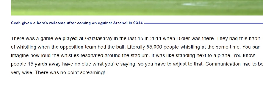 2014 yılında Drogba'nın da orada olduğu zamanda Galatasaray ile deplasmanda oynamıştık. Taraftarların top rakipteyken ıslık çalma alışkanlığı vardı. 55 bin kişi aynı anda ıslık çalıyordu. Statta ne kadar yüksek yankılandığını hayal edebilirsiniz. Bir uçağın yanında durmak gibiydi. 15 metrede ötedeki arkadaşının ne dediğini anlayamıyordun.