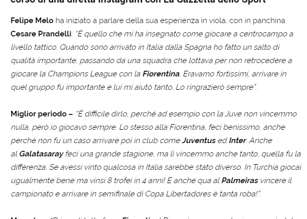 "En iyi dönemim hakkında konuşmak zor. Örneğin Juventus'ta oynarken kupa kazanamadım ama düzenli oynadım. Fiorentina'da da aynısı oldu. Juventus ve Inter gibi kulüplere gitmem tesadüf değildi. Galatasaray'da harika sezonlar geçirdim ve çok fazla kazandık, farkı buydu. Ayrıca Galatasaray'da çok farklı bir aile ortamımız vardı. İtalya'da bir şeyler kazansam çok farklı olurdu. Türkiye'de aynı sürede, 4 yılda 8 kupa kazandım. Palmeiras'ta da şampiyon oldum ve Libertadores'te yarı finale yükseldik.