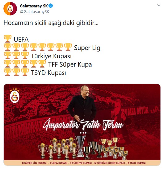 Ali Koç'un açıklamaları sonrası Galatasaray Kulübü'nden yapılan paylaşımda, "Hocamızın sicili aşağıdaki gibidir" denilerek Fatih Terim'in kazandığı kupaların yer aldığı bir fotoğraf paylaşıldı.