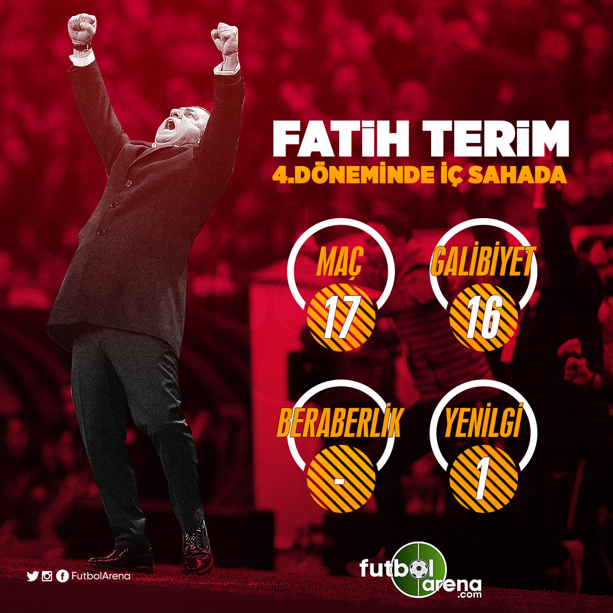 Öte yandan Galatasaray'ın başına 4. kez geçene Fatih Terim'in iç sahada performansı ise oldukça parlak. Galatasaray ile Türk Telekom Stadı'nda toplam 17 karşılaşmaya çıkan başarılı teknik adam sadece 1 yenilgi gördü. Fatih Terim geride kalan 16 maçtan galibiyet ile aydıldı.