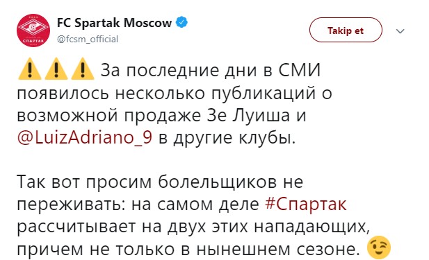 Rus kulübünün Twitter hesabından yapılan paylaşımda taraftarların he riki oyuncu için de endişelenmemesi gerektiği ve golcü futbolcuların satılmayacağı vurgulanarak, "Son günlerde Ze Luis ve Luiz Adriano için transfer haberleri yer almaktadır. Taraftarlarımız endişe etmesin. İki golcüyle de devam edeceğiz" açıklaması yapıldı.