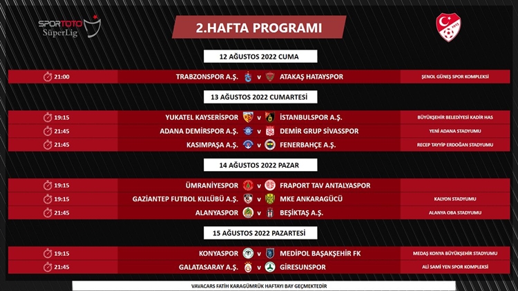 Sezon, son şampiyon Trabzonspor'un deplasmanda Süper Lig'in yeni takımı İstanbulspor ile yapacağı maçla açılacak. Karşılaşma, 5 Ağustos Cuma günü saat 19.15'te başlayacak.