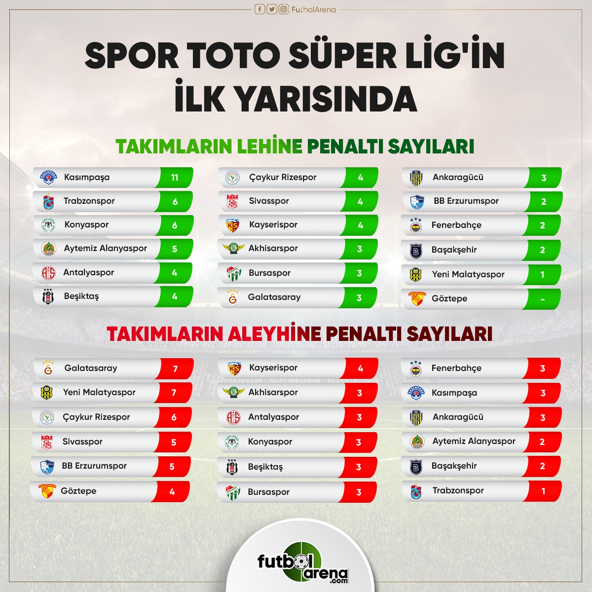 Süper Lig'in ilk yarısını 29 puanla 5. sırada tamamlayan Galatasaray'ın aleyhine ilk yarıda 7 kez penaltı verildi. Sarı kırmızılılar, Yeni Malatyaspor ile birlikte aleyhine en fazla penaltı verilen takım konumunda. Çaykur Rizespor, Sivasspor ve BB Erzurumspor da bu iki takımın arkasında sıralandı.