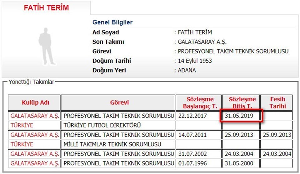 Türkiye Futbol Federasyonu’nun resmi internet sitesinde yer alan bilgilerde Fatih Terim’in sözleşmesi sezon sonunda bitecek.