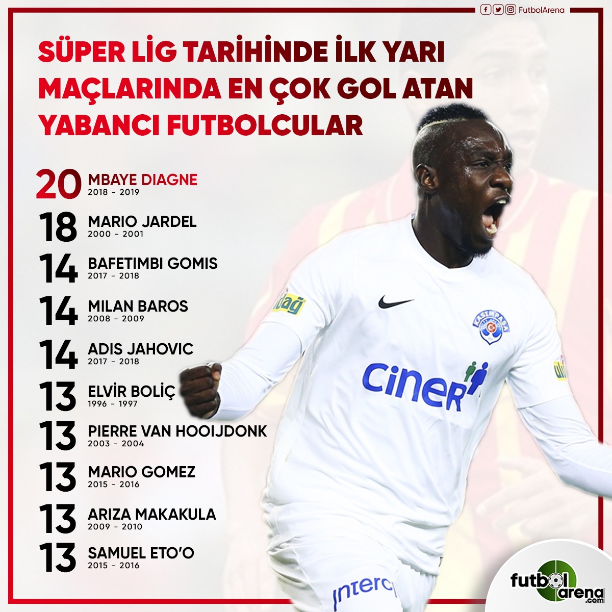 Kasımpaşa'da fırtına gibi esen Mbaye Diagne, bu sezon 1'i Türkiye Kupası olmak üzere 18 resmi maçta 19 gol ve 2 asiste imz attı. Üç büyükleri de boş geçmeyen Mbaye Diagne, bu sezon Süper Lig'de Beşiktaş 2, Fenerbahçe ve Galatasaray'a 1'er gol attı.