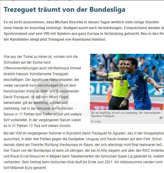 Alman basınında Kicker'ın haberine göre, Stuttgart kulübü Ocak ayında Trezeguet'yi transfer etmek için harekete geçti. Mısırlı futbolcunun transfer bedelinin 5 milyon euro civarında olacağı kaydedilirken, Trezeguet'nin ise Bundesliga'da oynamaya sıcak baktığı öğrenildi.