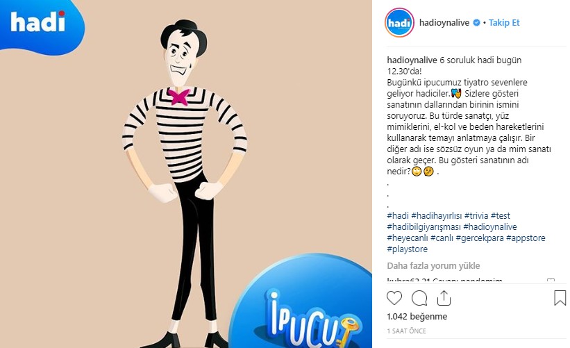 İlgi ile takip edilen yarışma programı Hadi yarışmasının bugün ki sorusunun ipucu sorusu açıklandı. Hadi Instagram hesabından açıklanan soru sonrasında vatandaşlar internet arama motorlarında Hadi yarışması sorusu yanıtını araştırmaya başladı. Hadi yarışmasında bugün 'Sözsüz oyun veya mim sanatı olarak adlandırılan gösteri sanatına ne ad verilir?' sorusu soruldu. Hadi yarışması sorusunun cevabı haberimizde.