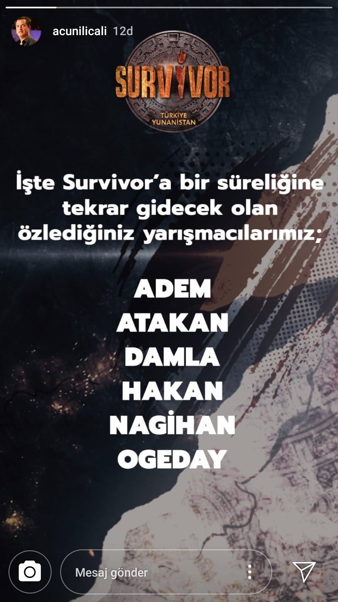 Survivor Türkiye Yunanistan yarışmasına eski yarışmacılar katılacak. Acun Ilcalı'nın sosyal medyadan yaptığı paylaşımla duyurduğu gelişme sonrası Survivor eski yarışmacılardan kimler katılacak sorusu akıllara geldi. Survivor eski yarışmacılar arasında yer alan Adem, Ogeday, Atakan, Nahigan, Hakan ve Damla yeniden Survivor yarışmasına katılacak. Survivor Türkiye Yunanistan yarışmasında bu 6 isim yer alacak. Acun Ilcalı'nın yaptığı paylaşım şu şekilde: